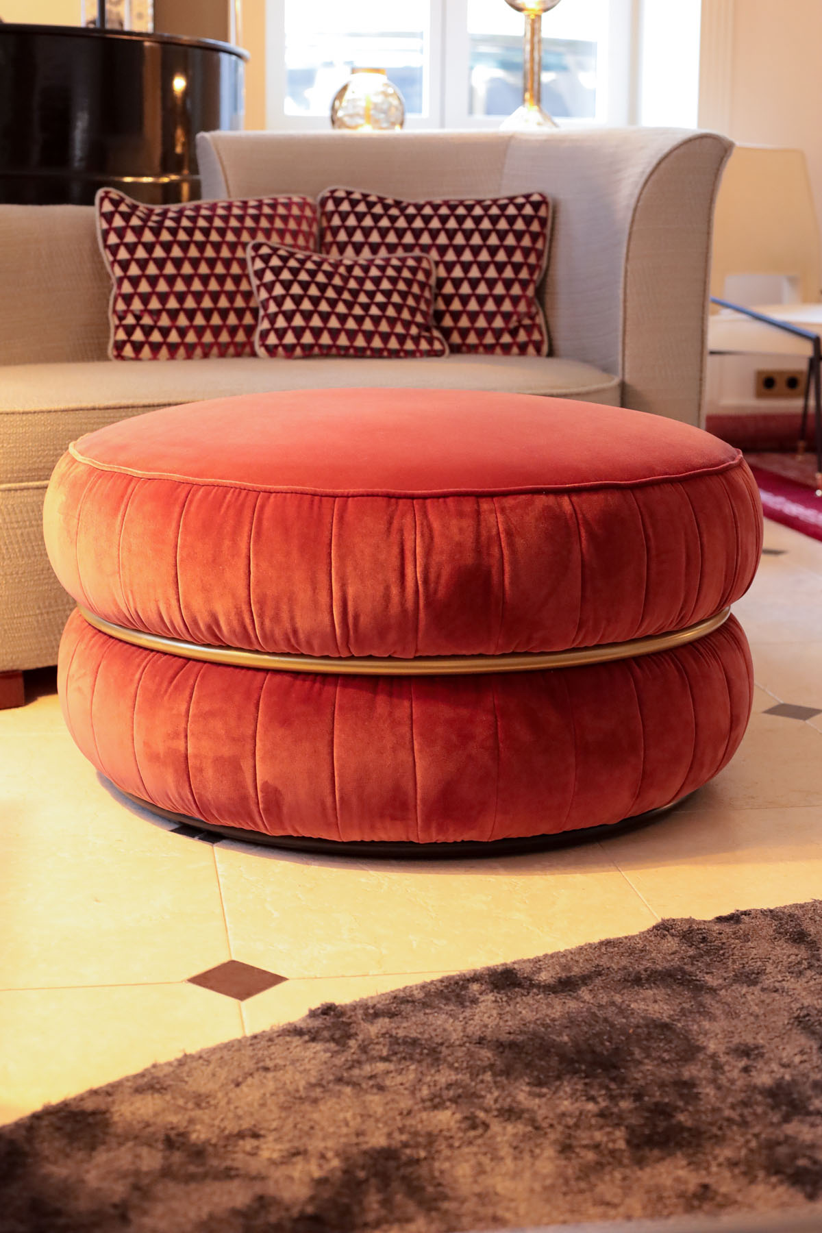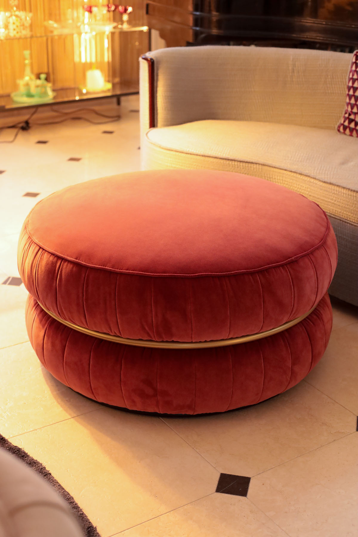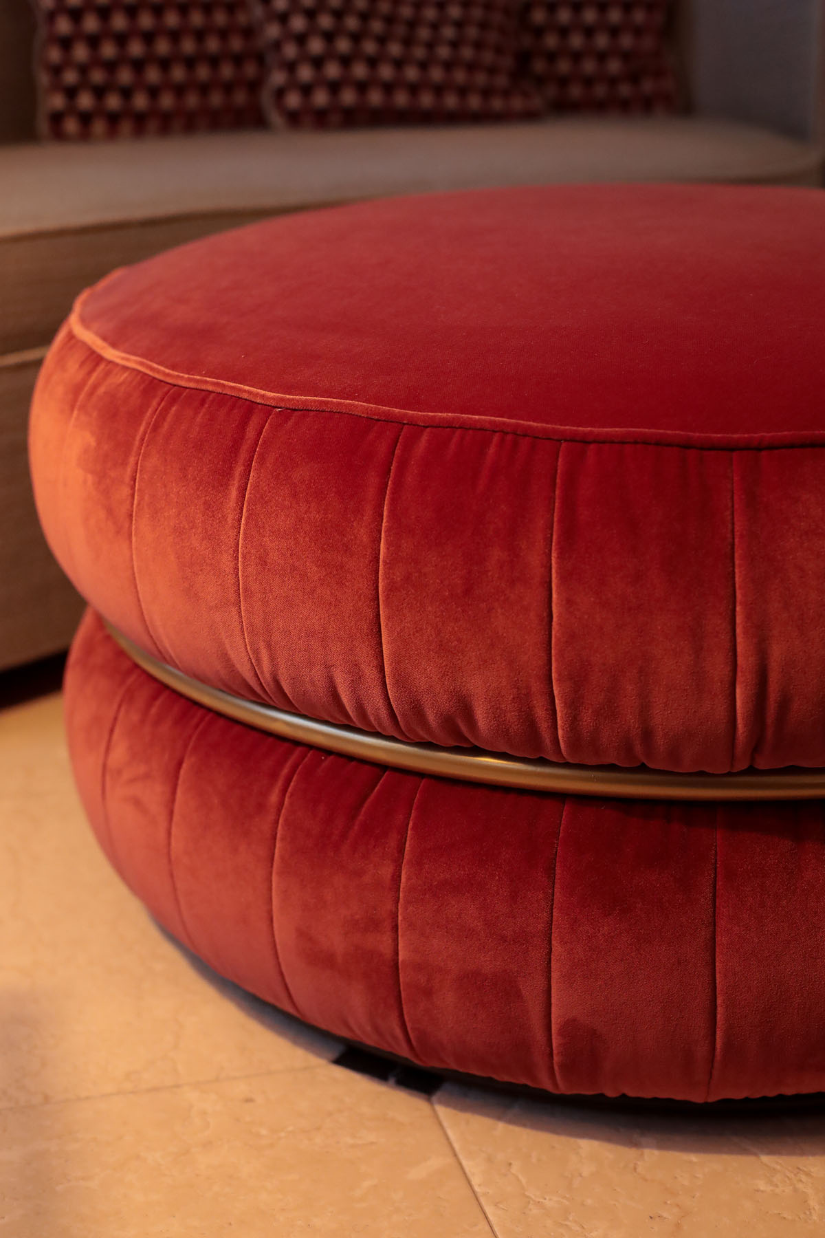 Изысканность жилого пространства достигается за счёт баланса всех объектов, функциональности и эстетики. Благодаря разнообразию форм и высоты, пуф Lillo привносит элегантность и комфорт в любой интерьер. Металлическое кольцо с матово-золотой отделкой гармонирует с мягкостью тканей, отделанных изысканной бархатной тканью.