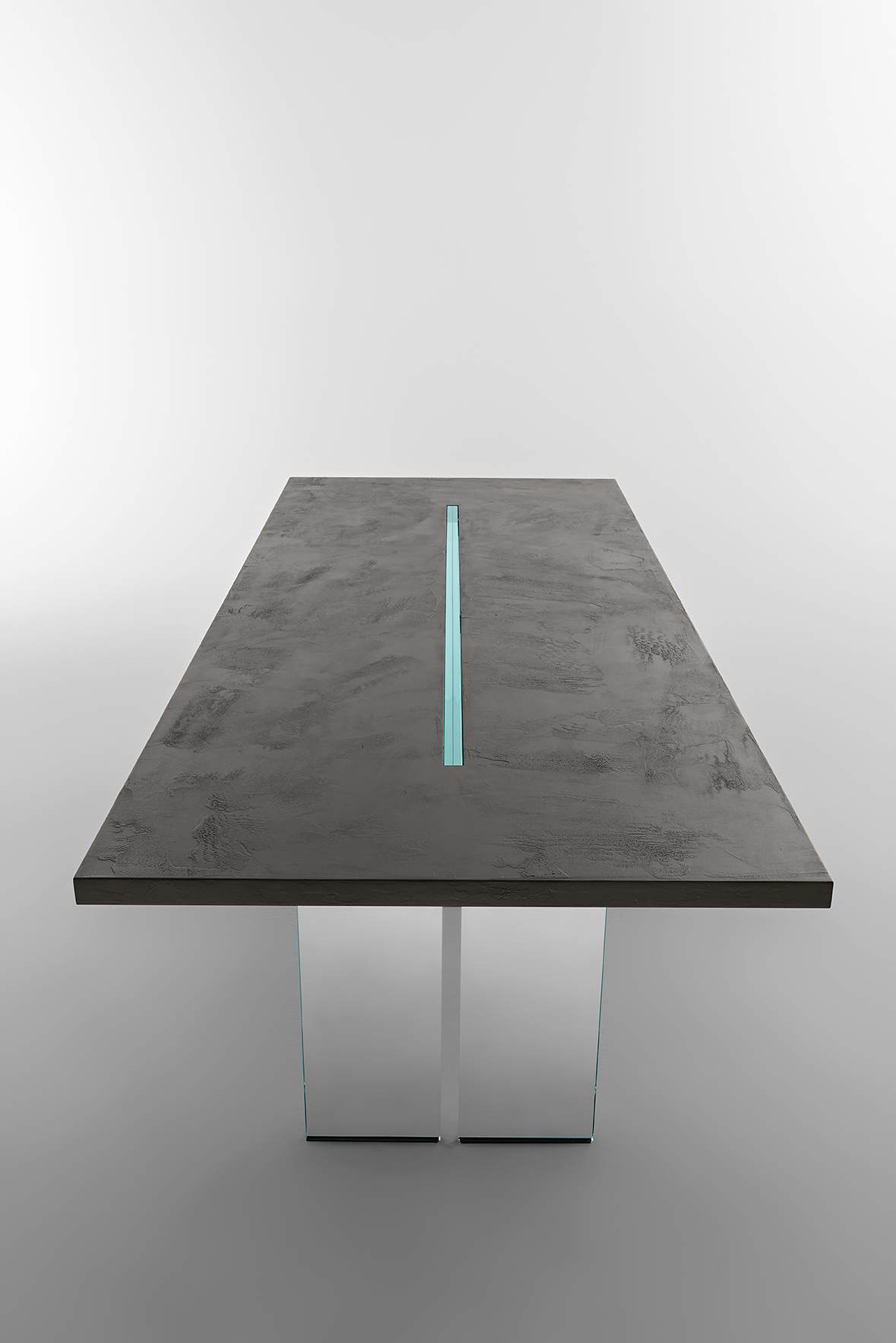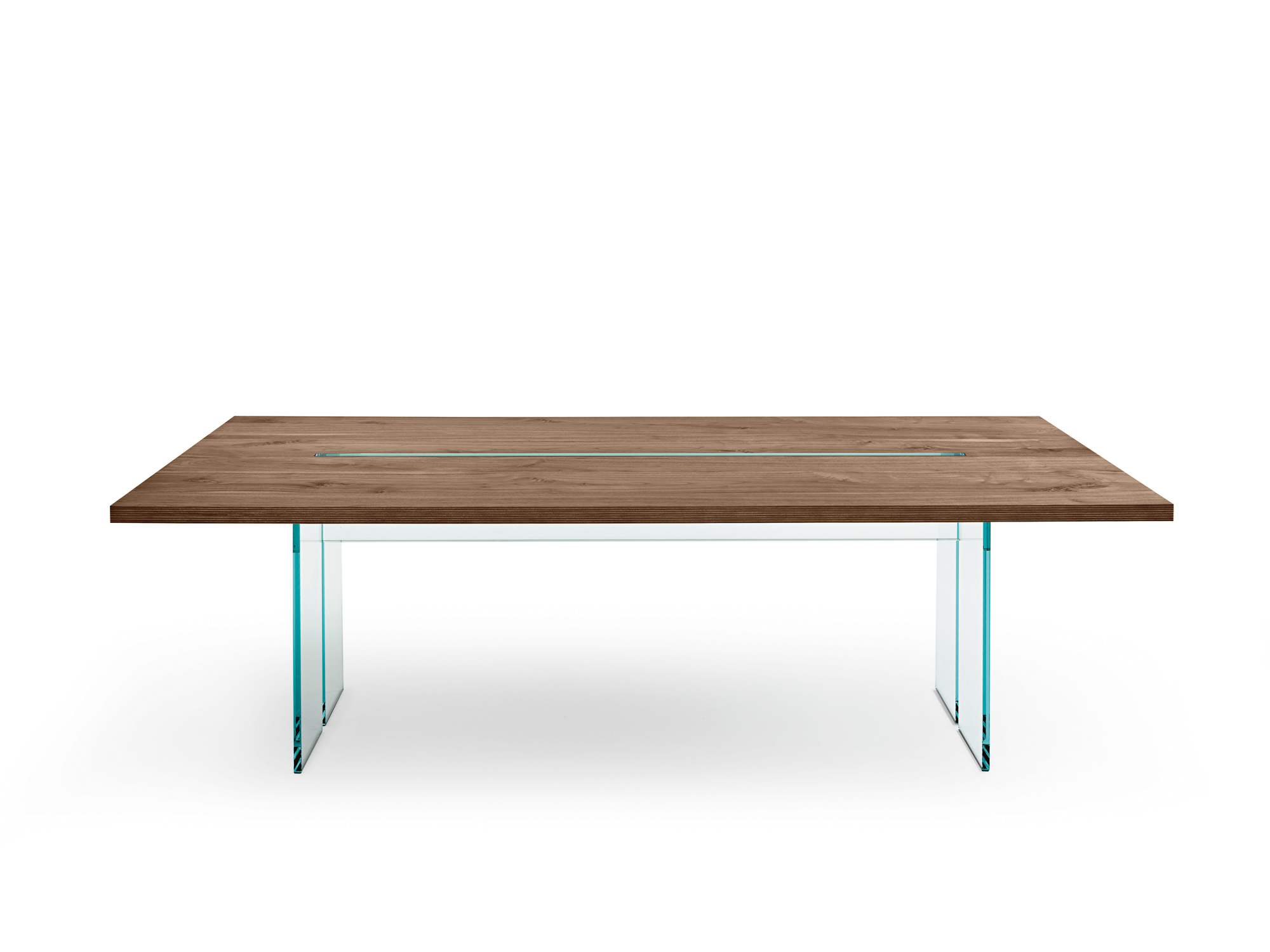 Стол со столешницей из многослойной фанеры толщиной 40 мм. Варианты отделки столешницы: шпон ореха каналетто; дуб с отделкой «старый стиль»; дерево с шероховатой текстурой Ecomalta. Каркас из многослойного стекла толщиной 30 мм в прозрачном или extralight исполнении, ножки из прозрачного стекла или extralight стекла толщиной 19 мм.