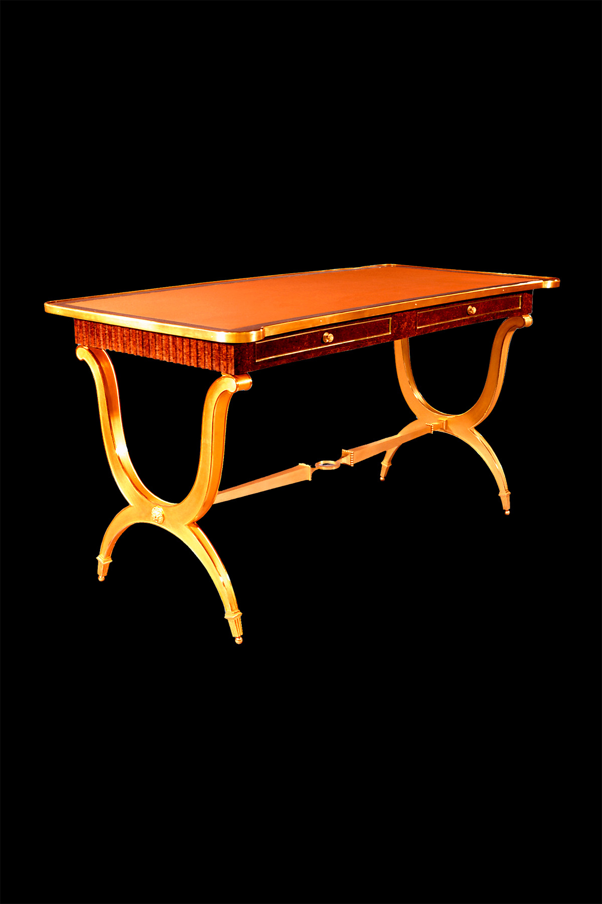 Письменный стол в стиле ар-деко, отделанный шпоном капа амбойны и позолоченной бронзой, с двумя ящиками. Дизайн вдохновлен работами Андре Арбуса.