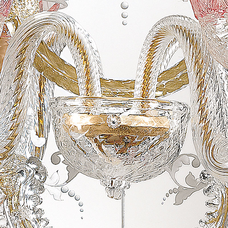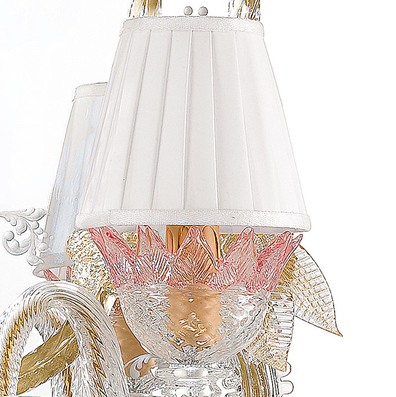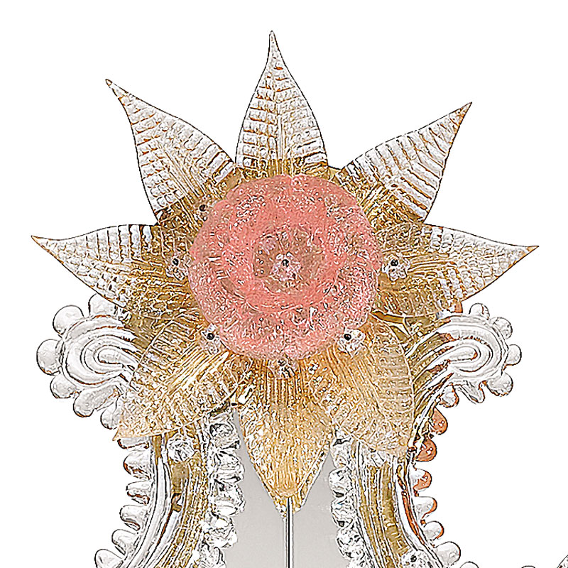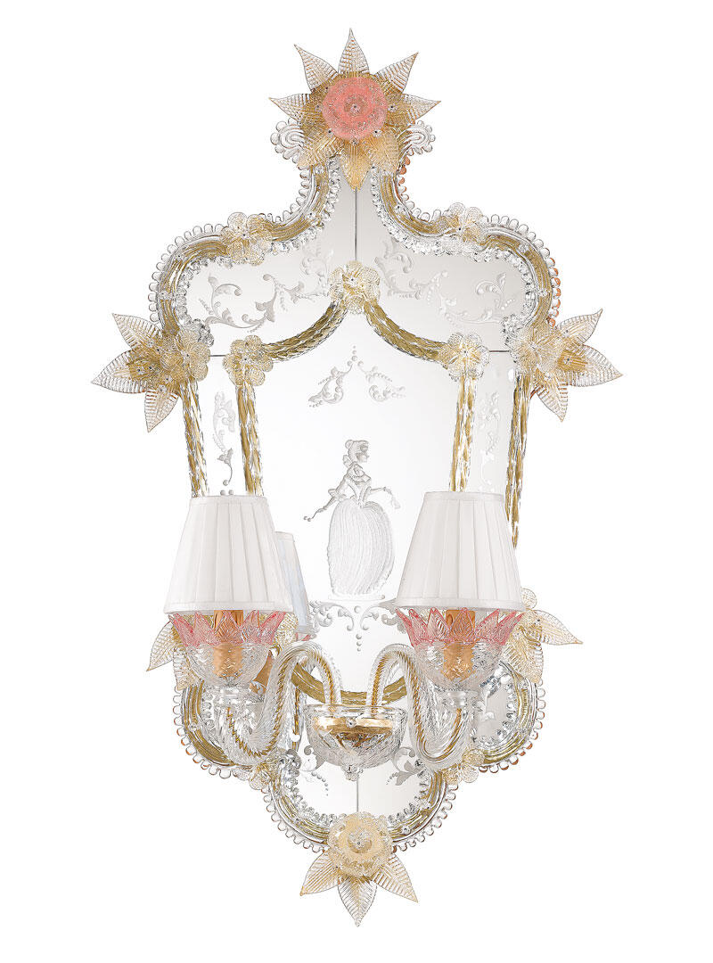 Венецианское зеркало ручной работы Giustinia, Arte Veneziana. Конструкция выполнена из дерева с отделкой цвета грецкого ореха. Цветочный мотив и изображение Венецианской графини Керини. Декоративные листья, кудри, розетки и плетеные веревки из прозрачного и золотистого муранского стекла. Два абажура из белой плиссированной ткани. Стаканы и главная розетка из розового муранского стекла.