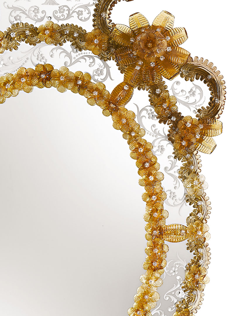 Венецианское зеркало ручной работы Ottoboni, Arte Veneziana. Конструкция выполнена из дерева с отделкой цвета грецкого ореха. Декоративные листья, завитки, розетки и плетеные веревки из янтарного муранского стекла. Цветочные мотивы.